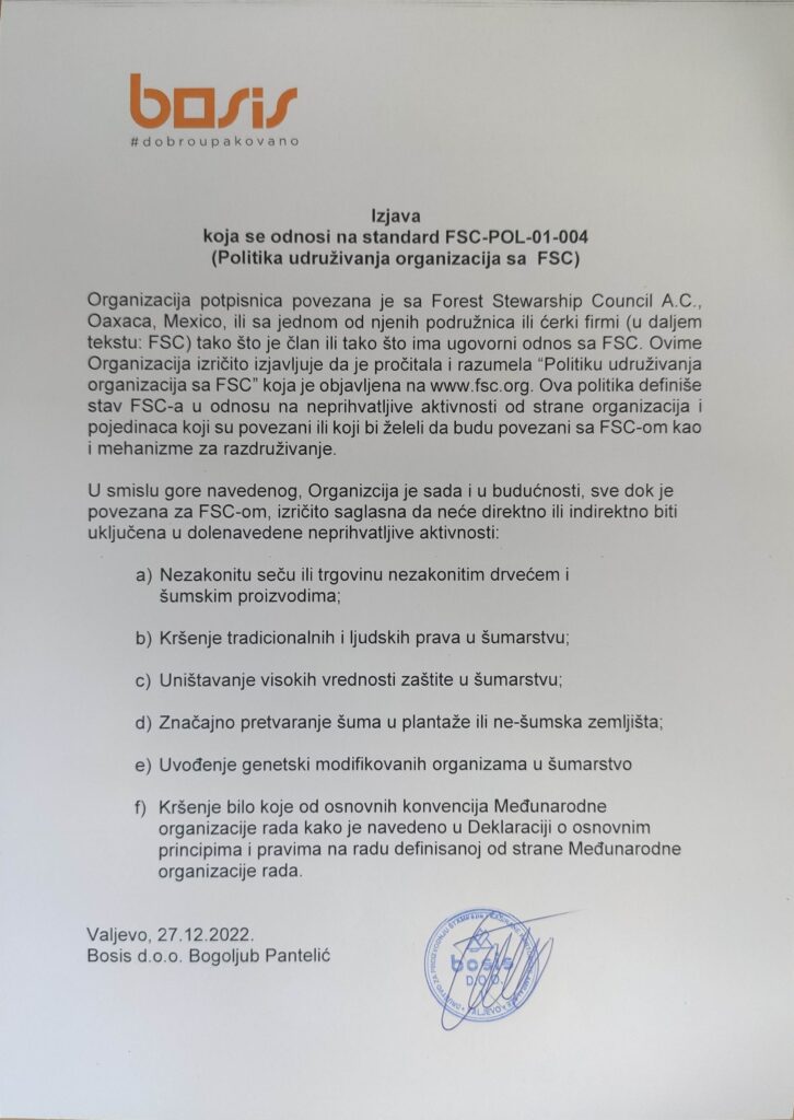Bosis se sertifikovao prema zahtevima FSC™ standarda u maju 2016. godine od strane SGS.